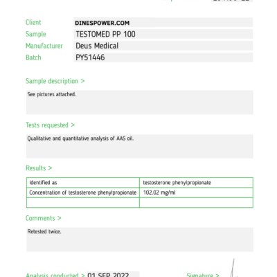 TESTOMED PP 100 (Testosterone Phenylpropionate) ist ein synthetisches anabol-androgenes Steroid und ein Androgenester – insbesondere der C17β-Phenylpropionatester von Testosteron.