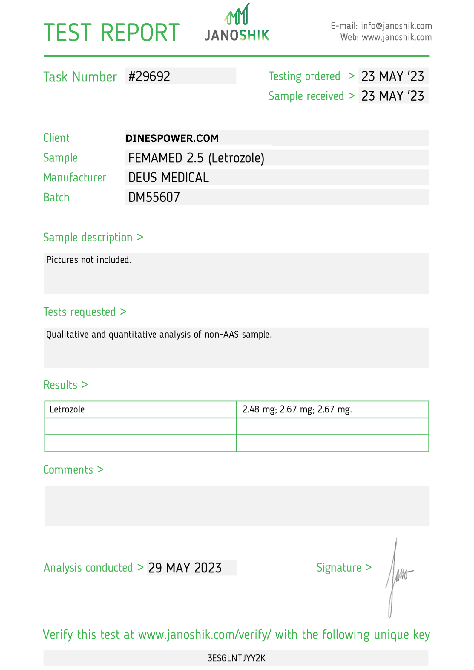 Letrozol von Dinespower hat garantierte Authentizität und hohe Reinheit. Jede Produkt wird von unabhängigen Laboren geprüft und mit einem Verifizierungscode versehen, damit Sie genau wissen, was Sie erhalten. Sie können Letrozol diskret und vertrauensvoll kaufen, dank schnellem Versand und sicherer Verpackung. Dinespower bietet erstklassigen Support und gleichbleibende Qualität und wird von vielen Bodybuilding- und Sport-Fans geschätzt.