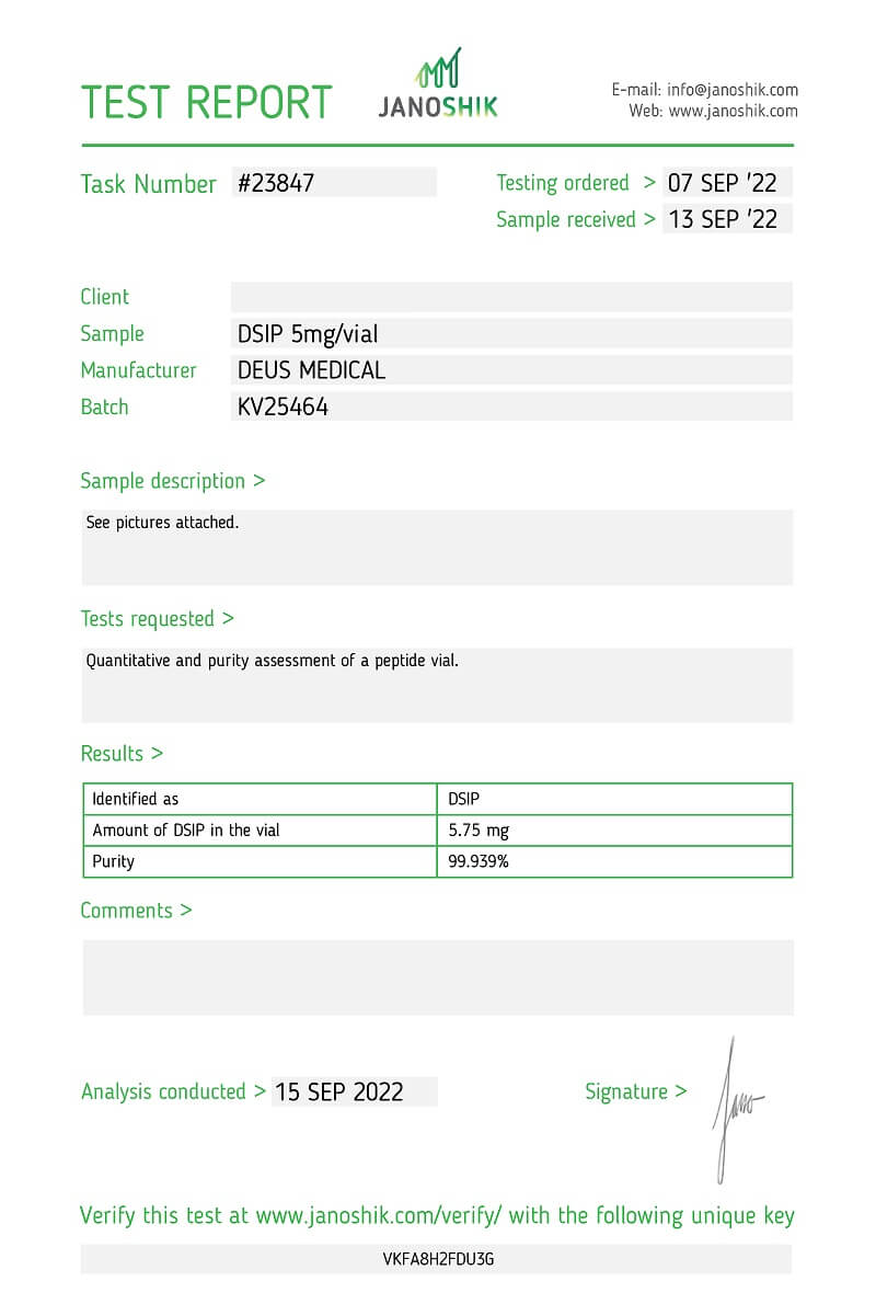DSIP Peptide 5 mg ist jetzt im DinesPower-Shop erhältlich. Man kann noch heute DSIP kaufen. Unsere Berater stehen Ihnen zur Verfügung, um Sie hinsichtlich der optimalen DSIP Dosierung und des DSIP Wirkung zu beraten. Die überwältigend positiven DSIP Erfahrungen der Kunden unterstreichen die Zuverlässigkeit dieses Produkts.