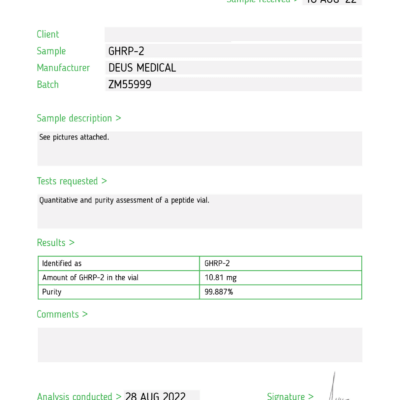 GHRP-2 (Growth Hormone-Releasing Peptide-2) ist ein synthetisches Peptid, das die Freisetzung von Wachstumshormonen (GH) durch die Hypophyse stimuliert. Es gehört zu einer Klasse von Peptiden, die als Wachstumshormon-Sekretagoga bekannt sind. Es enthält auch GHRP-6 und Ipamorelin.