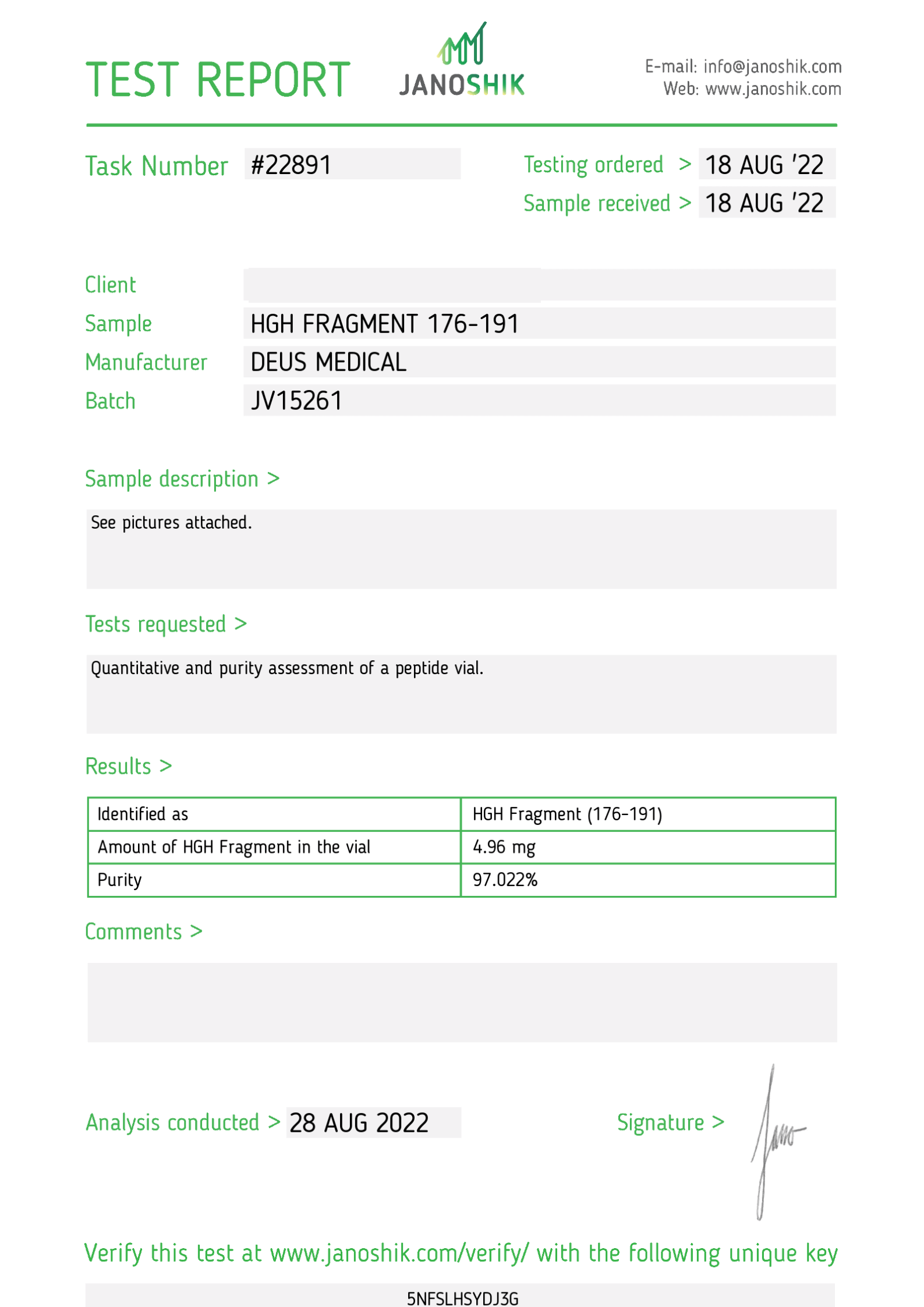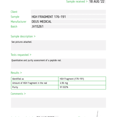Fragmentiertes HGH 176-191 wird so genannt, weil dieses Peptid, wie der Name schon sagt, ein Fragment ist, das einen Teil der Gesamtfunktionen des Wachstumshormons erfüllt, das üblicherweise als HGH bezeichnet wird. Dieses Peptid ist ein Teil der gesamten HGH 191aa-Sequenz, von der bekannt ist, dass sie für den Fettabbau verantwortlich ist. Dieses „isolierte“ Fragment (176-191) von HGH ist für die Oxidation von Körperfett zuständig, daher dient es einfach dazu, Fett zu oxidieren.
