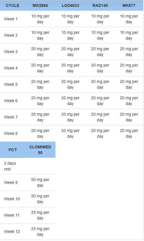 - LGD4033 (Ligandrol) — 10 mg pro Tag für die ersten 2 Wochen, dann 20 mg pro Tag bis Ende des Zyklus.